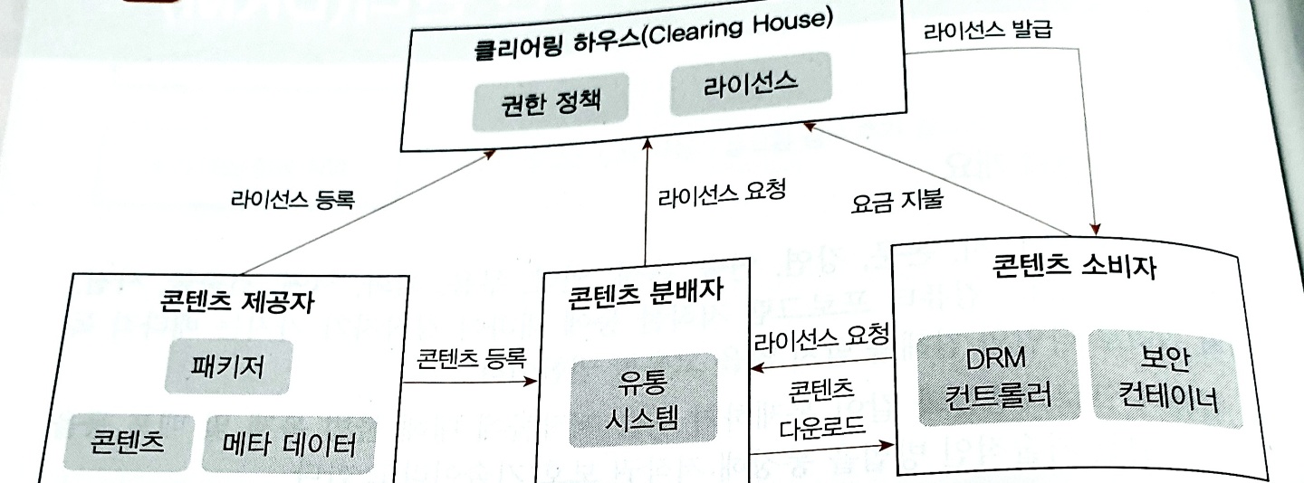 - 클리어링 하우스(Clearing House): 저작권에 대한 사용 권한, 라이선스 발급, 사용량에 따른 관리 등을 수행하는 곳