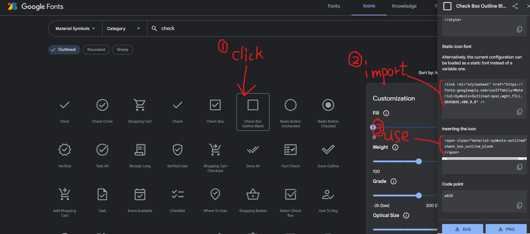 아래 참고 링크를 들어가서 원하는 아이콘을 클릭하면 사이드바가 나타나는데 원한다면 사이드바 아래에 SVG, PNG 파일로 다운로드 받아서 사용 가능하고, 구글폰트를 임포트해서 폰트 속성을 적용할 수 있게 사용하고 싶다면, 아래 이미를 참고하여 순서대로 진행 하면 선택한 아이콘이 렌더링 되는 것을 확인할 수 있다.