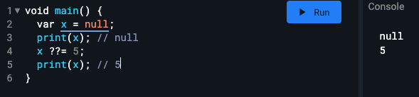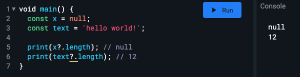다트는 ?., ??, ??= 세 가지 널 인지 연산자를 제공합니다.