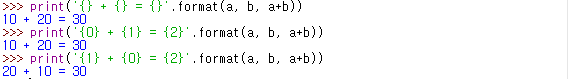 # 자동 인덱싱, {}안에 인덱스를 입력하지 않을 경우 앞자리부터 0, 1, 2 순서로 자동 인덱싱된다.